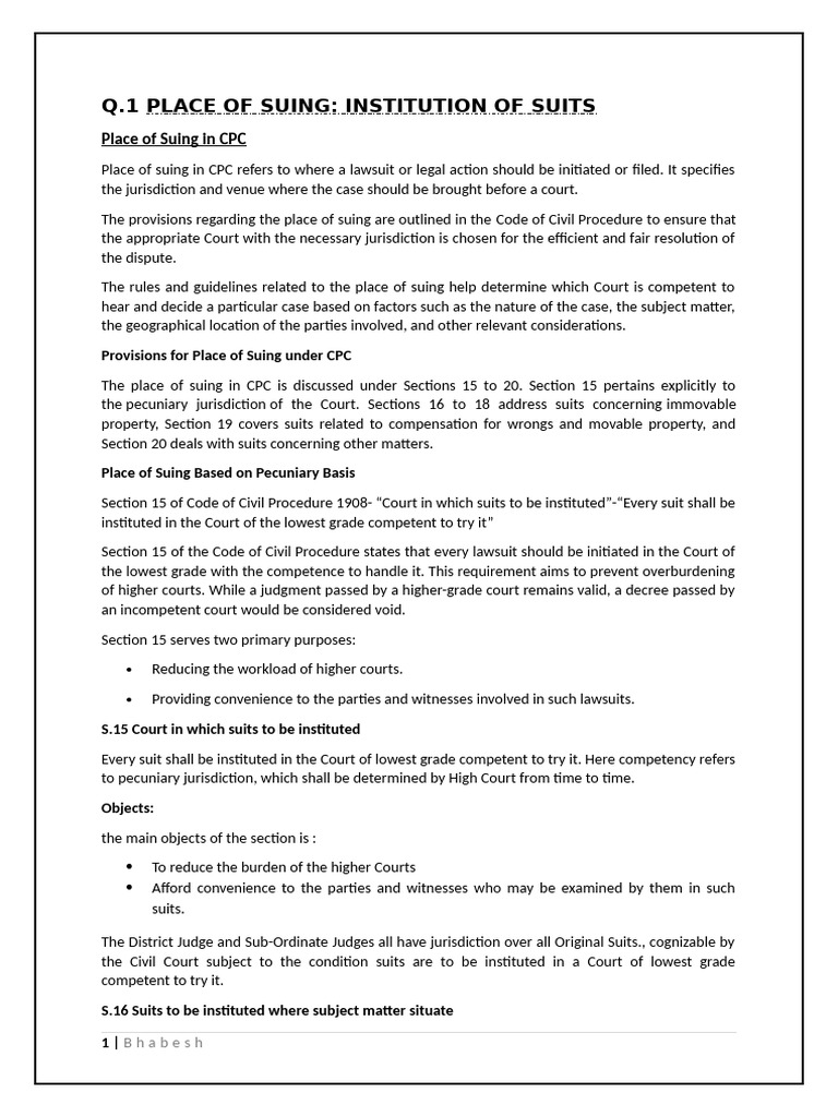 1 PLACE OF SUING: INSTITUTION OF SUITS