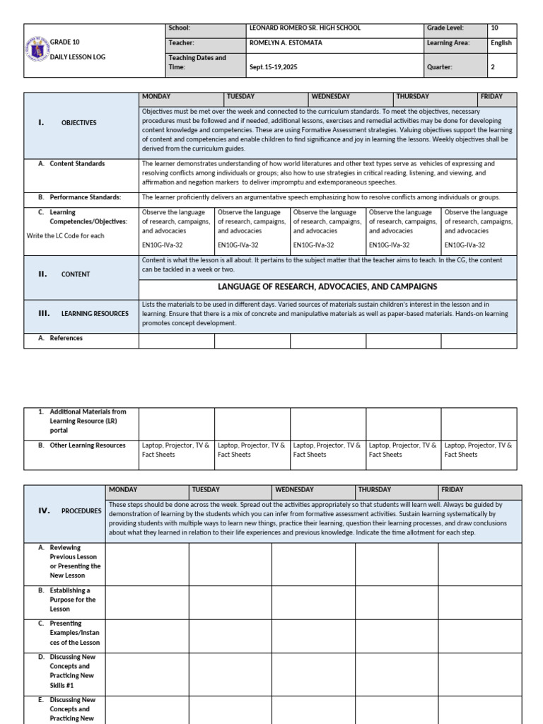 GRADE 10 Teacher: ROMELYN A. ESTOMATA Learning Area: English