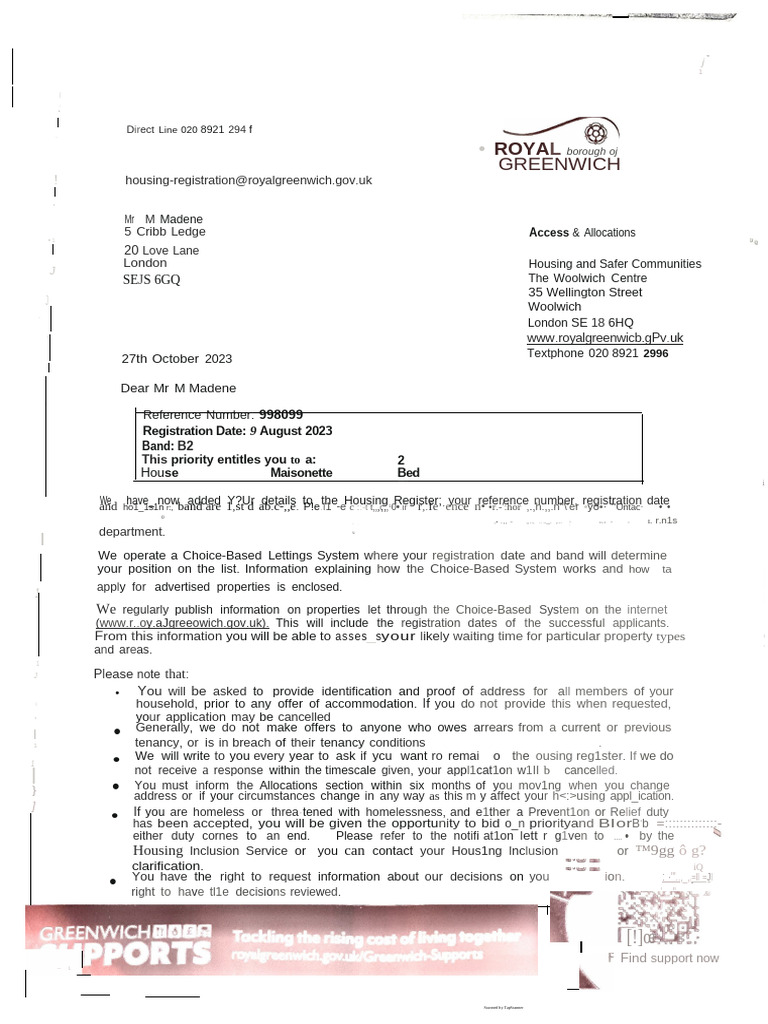 and have_ now added Y?Ur details to the Housing Register; your reference number, registration date