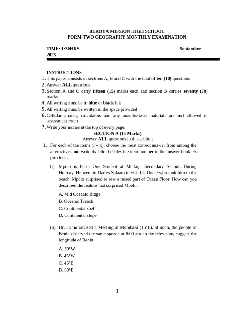 FORM TWO GEOGRAPHY MONTHLY EXAMINATION