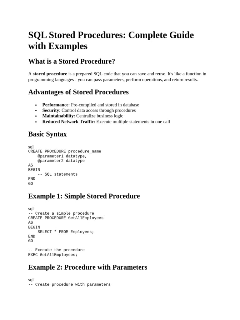 A stored procedure is a prepared SQL code that you can save and reuse. It's like a function in