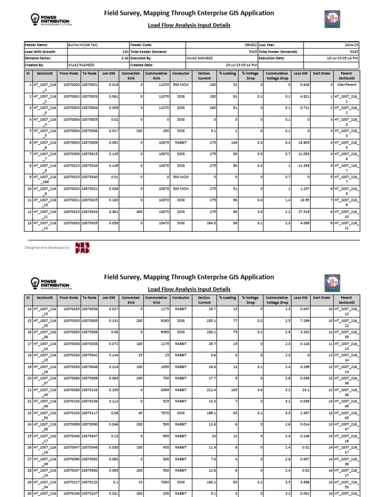 Sr SectionID From Node To Node Len KM Connected Commulative Conductor Section % Loading % Voltage Commulative Loss KW Sort Order Parent