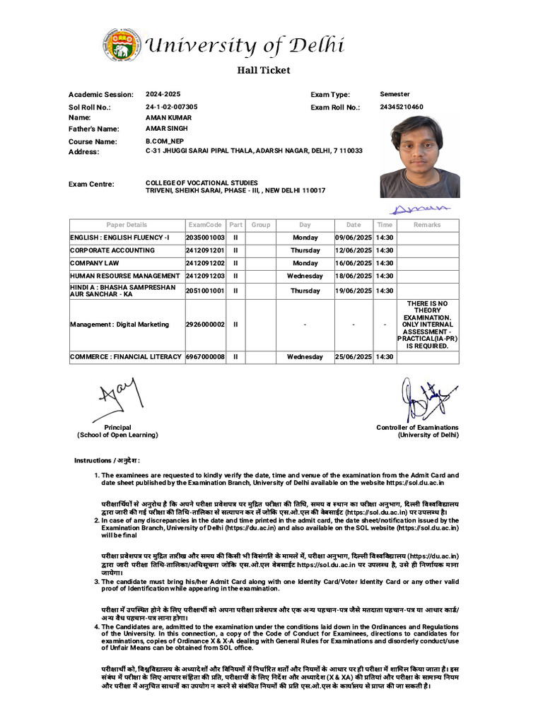 परीक्षा प्रवेशपत्र पर मुद्रित तारीख और समय की किसी भी विसंगति के मामले में, परीक्षा अनुभाग, दिल्ली विश्वविद्यालय (https://du.ac.in)