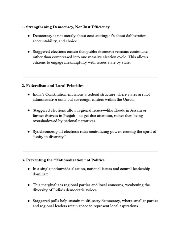 ● Y.V. Reddy (Former RBI Governor) argued that staggered elections
