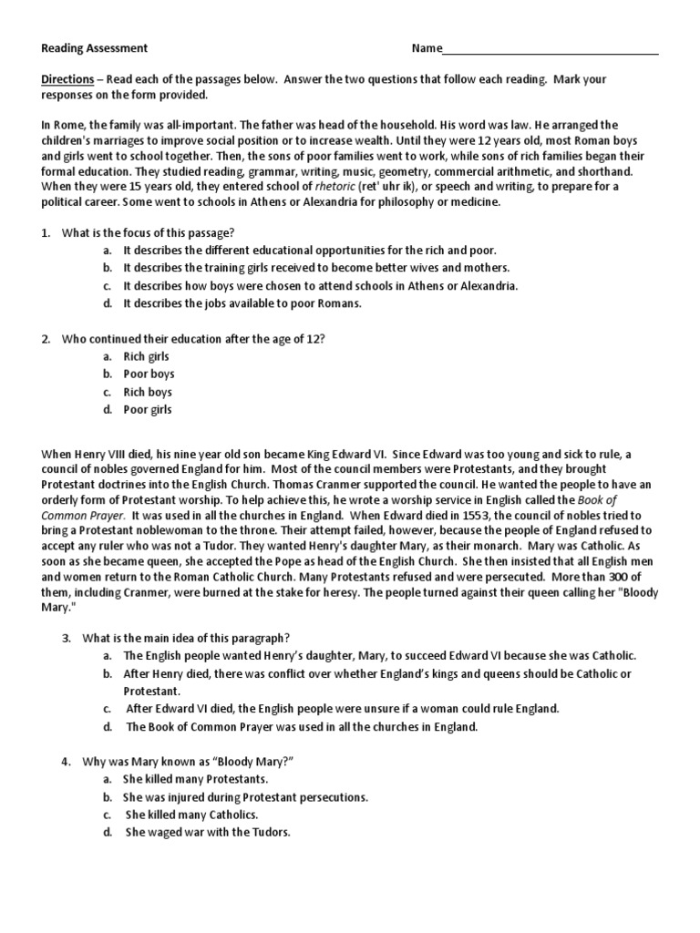 Directions Read each of the passages below. Answer the two questions that follow each reading. Mark your responses on the form provided. In Rome, the family was all-important. The father was head of the household. His word was law. He arranged the children's marriages to improve social position or to increase wealth. Until they were 12 years old, most Roman boys and girls went to school together. Then, the sons of poor families went to work, while sons of rich families began their formal education. They studied reading, grammar, writing, music, geometry, commercial arithmetic, and shorthand. When they were 15 years old, they entered school of rhetoric (ret' uhr ik), or speech and writing, to prepare for a political career. Some went to schools in Athens or Alexandria for philosophy or medicine. 1. What is the focus of this passage? a. It describes the different educational opportunities for the rich and poor. b. It describes the training girls received to become better wives and mothers. c. It describes how boys were chosen to attend schools in Athens or Alexandria. d. It describes the jobs available to poor Romans. 2. Who continued their education after the age of 12? a. Rich girls b. Poor boys c. Rich boys d. Poor girls