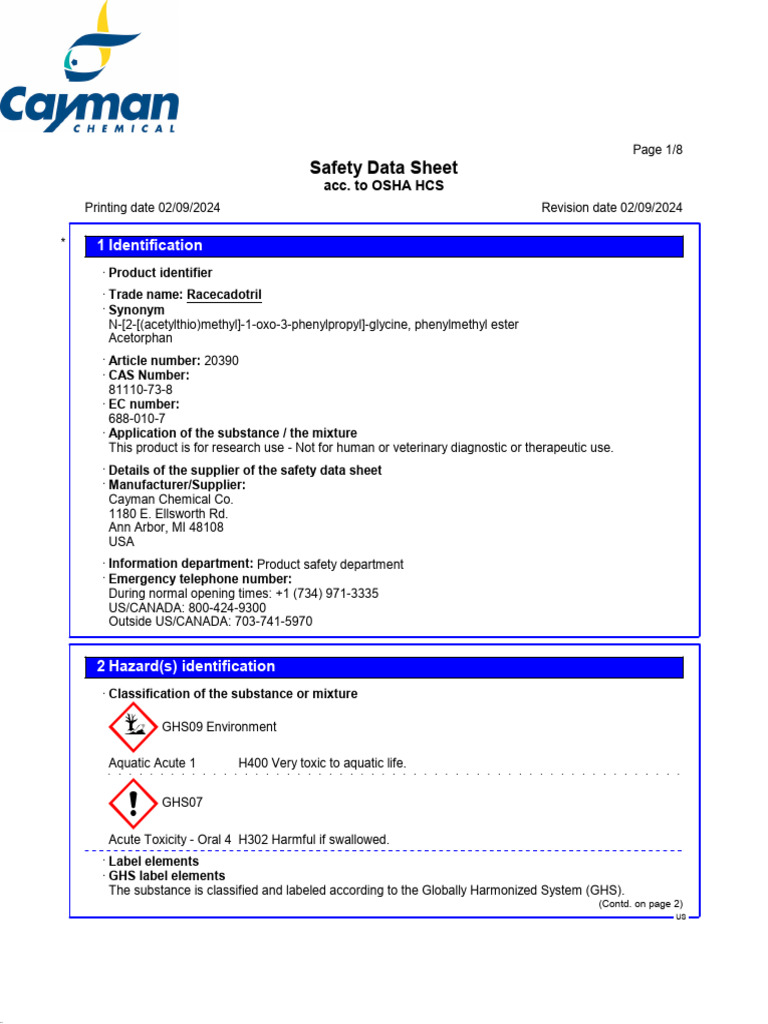 contaminated, it may pose hazards not mentioned in this SDS. Cayman Chemical Company assumes
