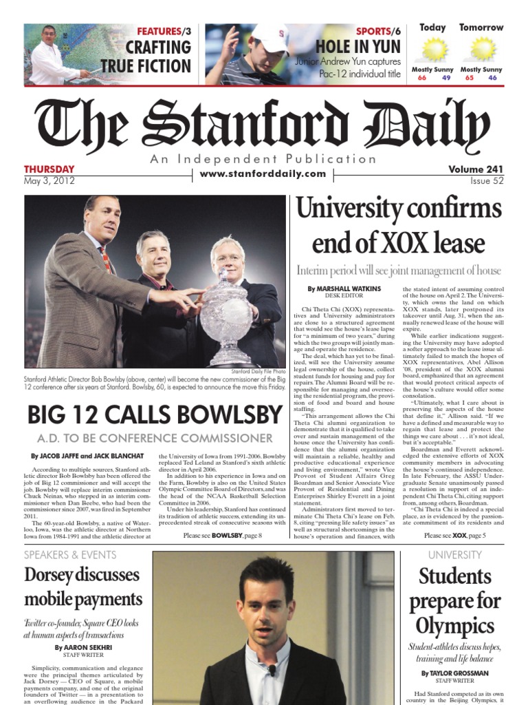 ior Stacey Tan made the singles bracket as well as an unseeded atlarge. For doubles, Gibbs and Burdette will team up as the No. 2 seed, while Tan will join freshman Ellen Tsay to form Stanfords second doubles entrant. Stanfords NCAA tournament sion with Stanford that ran through 2017. Bowlsby was highly influential in the resurgence of Stanford football during his time on the Farm, as he hired Jim Harbaugh as the head football coach in 2006. Bowlsby was also instrumental in the hiring process for Pac-12 commissioner Larry Scott and in the negotiations for the Pac-12s $3 billion dollar television deal in 2011. The Big 12 Conference is in the midst of change, starting with action will kick off May 11 at 2 p.m. with the Cardinal women hosting Stony Brook. The men begin May 12 at noon against Sacramento State. Contact Jacob Jaffe at jwjaffe@ stanford.edu. the departures of Colorado and Nebraska to the Pac-12 and Big Ten, respectively, last year. After a year with 10 schools, the Big 12 lost two more when Missouri and Texas A&M decided to leave for the SEC. Faced with the possibility of collapse, the Big 12 has agreed to add West Virginia and TCU to get back to 10 schools for next season. Contact Jacob Jaffe at jwjaffe @stanford.edu and Jack Blanchat at blanchat@stanford.edu.