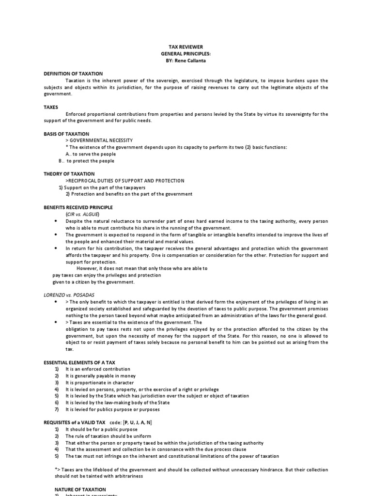 exercised through the legislature, to impose burdens upon the subjects and objects within its jurisdiction, for the purpose of raising revenues to carry out the legitimate objects of the government. TAXES Enforced proportional contributions from properties and persons levied by the State by virtue its sovereignty for the support of the government and for public needs. BASIS OF TAXATION > GOVERNMENTAL NECESSITY * The existence of the government depends upon its capacity to perform its two (2) basic functions: A.. to serve the people B.. to protect the people THEORY OF TAXATION >RECIPROCAL DUTIES OF SUPPORT AND PROTECTION 1) Support on the part of the taxpayers 2) Protection and benefits on the part of the government BENEFITS RECEIVED PRINCIPLE (CIR vs. ALGUE) Despite the natural reluctance to surrender part of ones hard earned income to the taxing authority, every person who is able to must contribute his share in the running of the government. The government is expected to respond in the form of tangible or intangible benefits intended to improve the lives of the people and enhanced their material and moral values. In return for his contribution, the taxpayer receives the general advantages and protection which the government affords the taxpayer and his property. One is compensation or consideration for the other. Protection for support and support for protection. However, it does not mean that only those who are able to pay taxes can enjoy the privileges and protection given to a citizen by the government. LORENZO vs. POSADAS > The only benefit to which the taxpayer is entitled is that derived form the enjoyment of the privileges of living in an organized society established and safeguarded by the devotion of taxes to public purpose. The government promises nothing to the person taxed beyond what maybe anticipated from an administration of the laws for the general good. > Taxes are essential to the existence of the government. The obligation to pay taxes rests not upon the privileges enjoyed by or the protection afforded to the citizen by the government, but upon the necessity of money for the support of the State. For this reason, no one is allowed to object to or resist payment of taxes solely because no personal benefit to him can be pointed out as arising from the tax. ESSENTIAL ELEMENTS OF A TAX 1) It is an enforced contribution 2) It is generally payable in money 3) It is proportionate in character 4) It is levied on persons, property, or the exercise of a right or privilege 5) It is levied by the State which has jurisdiction over the subject or object of taxation 6) It is levied by the law-making body of the State 7) It is levied for publics purpose or purposes REQUISITES of a VALID TAX code: [P, U, J, A, N] 1) It should be for a public purpose 2) The rule of taxation should be uniform 3) That either the person or property taxed be within the jurisdiction of the taxing authority 4) That the assessment and collection be in consonance with the due process clause 5) The tax must not infringe on the inherent and constitutional limitations of the power of taxation *> Taxes are the lifeblood of the government and should be collected without unnecessary hindrance. But their collection should not be tainted with arbitrariness NATURE OF TAXATION 1) Inherent in sovereignty 2) Legislative in character