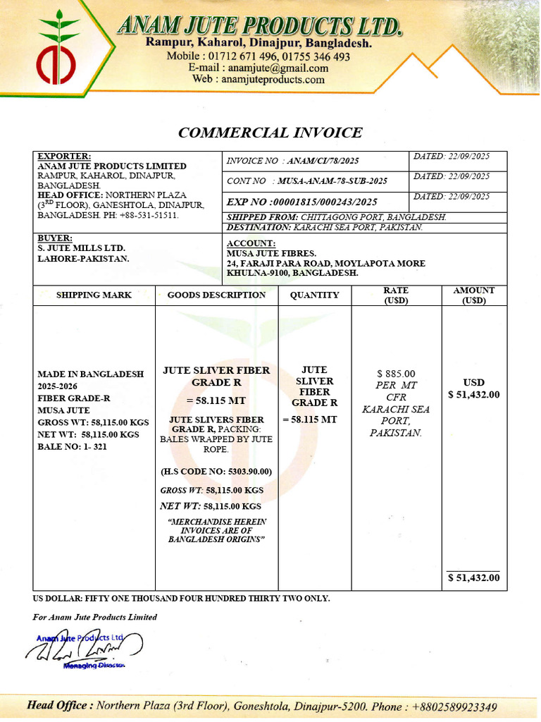 S. JUTE MILLS LTD. MUSA JUTE FIBRES.