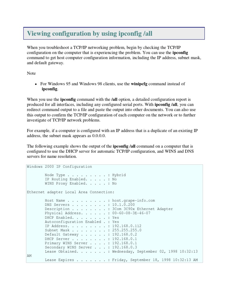 ipconfig. When you use the ipconfig command with the /all option, a detailed configuration report is produced for all interfaces, including any configured serial ports. With ipconfig /all, you can redirect command output to a file and paste the output into other documents. You can also use this output to confirm the TCP/IP configuration of each computer on the network or to further investigate of TCP/IP network problems. For example, if a computer is configured with an IP address that is a duplicate of an existing IP address, the subnet mask appears as [Link]. The following example shows the output of the ipconfig /all command on a computer that is configured to use the DHCP server for automatic TCP/IP configuration, and WINS and DNS servers for name resolution.