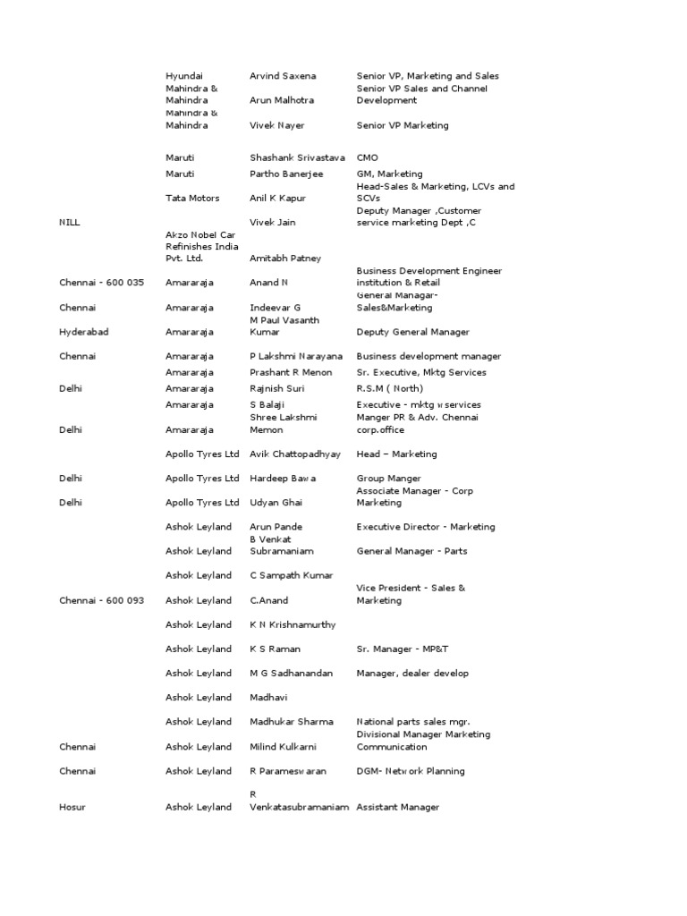 Amitabh Patney Anand N Indeevar G M Paul Vasanth Kumar P Lakshmi Narayana Prashant R Menon Rajnish Suri S Balaji Shree Lakshmi Memon Avik Chattopadhyay Hardeep Bawa Udyan Ghai Arun Pande B Venkat Subramaniam C Sampath Kumar C.Anand K N Krishnamurthy K S Raman M G Sadhanandan Madhavi Madhukar Sharma Milind Kulkarni R Parameswaran National parts sales mgr. Divisional Manager Marketing Communication DGM- Network Planning Sr. Manager - MP&T Manager, dealer develop Vice President - Sales & Marketing Business Development Engineer institution & Retail General ManagarSales&Marketing Deputy General Manager Business development manager Sr. Executive, Mktg Services R.S.M ( North) Executive - mktg wservices Manger PR & Adv. Chennai corp.office Head Marketing Group Manger Associate Manager - Corp Marketing Executive Director - Marketing General Manager - Parts