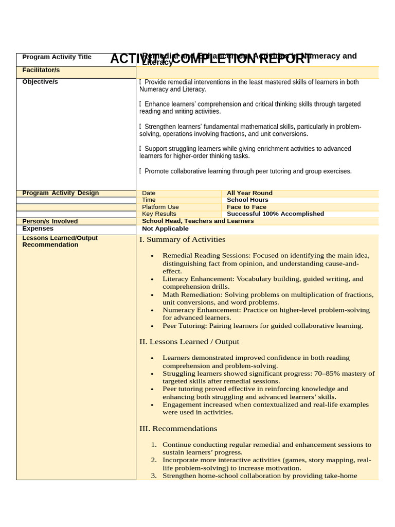 Objective/s Provide remedial interventions in the least mastered skills of learners in both