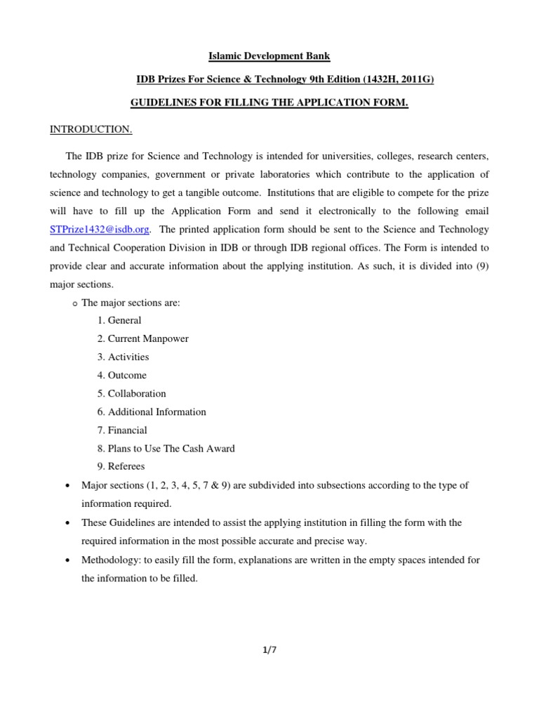 FILLING THE APPLICATION FORM. INTRODUCTION. The IDB prize for Science and Technology is intended for universities, colleges, research centers, technology companies, government or private laboratories which contribute to the application of science and technology to get a tangible outcome. Institutions that are eligible to compete for the prize will have to fill up the Application Form and send it electronically to the following email STPrize1432@isdb.org. The printed application form should be sent to the Science and Technology and Technical Cooperation Division in IDB or through IDB regional offices. The Form is intended to provide clear and accurate information about the applying institution. As such, it is divided into (9) major sections. o The major sections are: 1. General 2. Current Manpower 3. Activities 4. Outcome 5. Collaboration 6. Additional Information 7. Financial 8. Plans to Use The Cash Award 9. Referees Major sections (1, 2, 3, 4, 5, 7 & 9) are subdivided into subsections according to the type of information required. These Guidelines are intended to assist the applying institution in filling the form with the required information in the most possible accurate and precise way. Methodology: to easily fill the form, explanations are written in the empty spaces intended for the information to be filled.