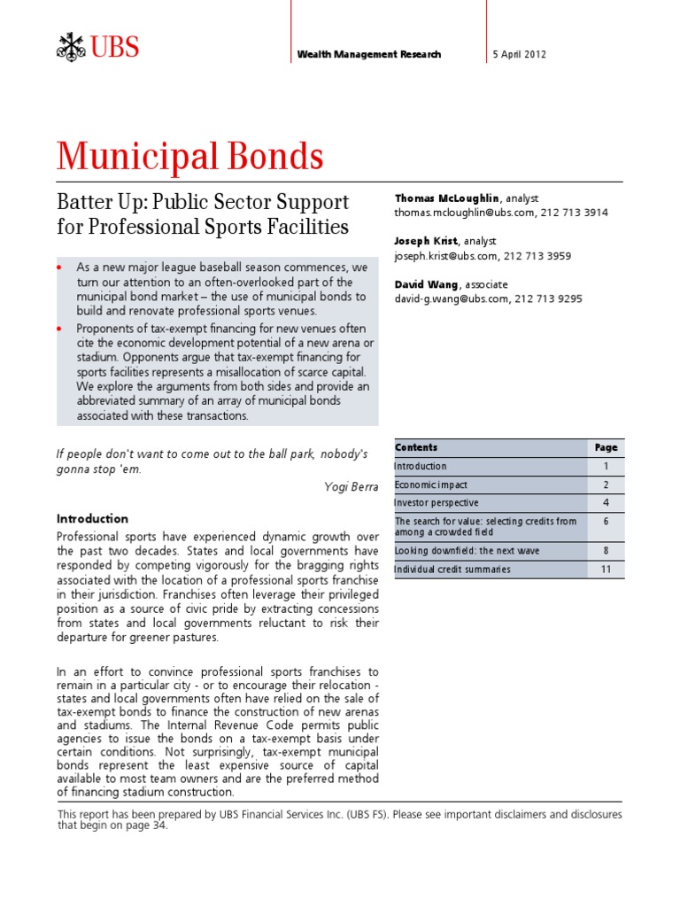 Professional sports have experienced dynamic growth over the past two decades. States and local governments have responded by competing vigorously for the bragging rights associated with the location of a professional sports franchise in their jurisdiction. Franchises often leverage their privileged position as a source of civic pride by extracting concessions from states and local governments reluctant to risk their departure for greener pastures. In an effort to convince professional sports franchises to remain in a particular city - or to encourage their relocation -states and local governments often have relied on the sale of tax-exempt bonds to finance the construction of new arenas and stadiums. The Internal Revenue Code permits public agencies to issue the bonds on a tax-exempt basis under certain conditions. Not surprisingly, tax-exempt municipal bonds represent the least expensive source of capital available to most team owners and are the preferred method of financing stadium construction.