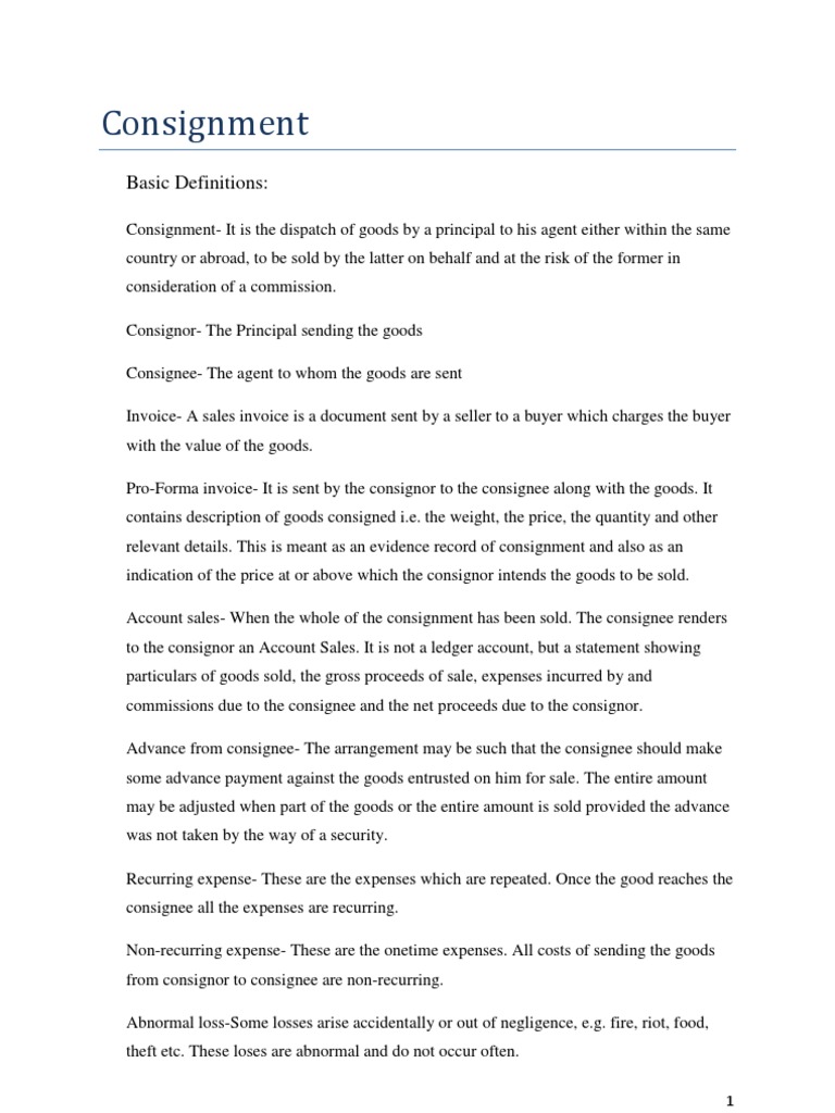 Consignment- It is the dispatch of goods by a principal to his agent either within the same country or abroad, to be sold by the latter on behalf and at the risk of the former in consideration of a commission. Consignor- The Principal sending the goods Consignee- The agent to whom the goods are sent Invoice- A sales invoice is a document sent by a seller to a buyer which charges the buyer with the value of the goods. Pro-Forma invoice- It is sent by the consignor to the consignee along with the goods. It contains description of goods consigned i.e. the weight, the price, the quantity and other relevant details. This is meant as an evidence record of consignment and also as an indication of the price at or above which the consignor intends the goods to be sold. Account sales- When the whole of the consignment has been sold. The consignee renders to the consignor an Account Sales. It is not a ledger account, but a statement showing particulars of goods sold, the gross proceeds of sale, expenses incurred by and commissions due to the consignee and the net proceeds due to the consignor. Advance from consignee- The arrangement may be such that the consignee should make some advance payment against the goods entrusted on him for sale. The entire amount may be adjusted when part of the goods or the entire amount is sold provided the advance was not taken by the way of a security. Recurring expense- These are the expenses which are repeated. Once the good reaches the consignee all the expenses are recurring. Non-recurring expense- These are the onetime expenses. All costs of sending the goods from consignor to consignee are non-recurring. Abnormal loss-Some losses arise accidentally or out of negligence, e.g. fire, riot, food, theft etc. These loses are abnormal and do not occur often.