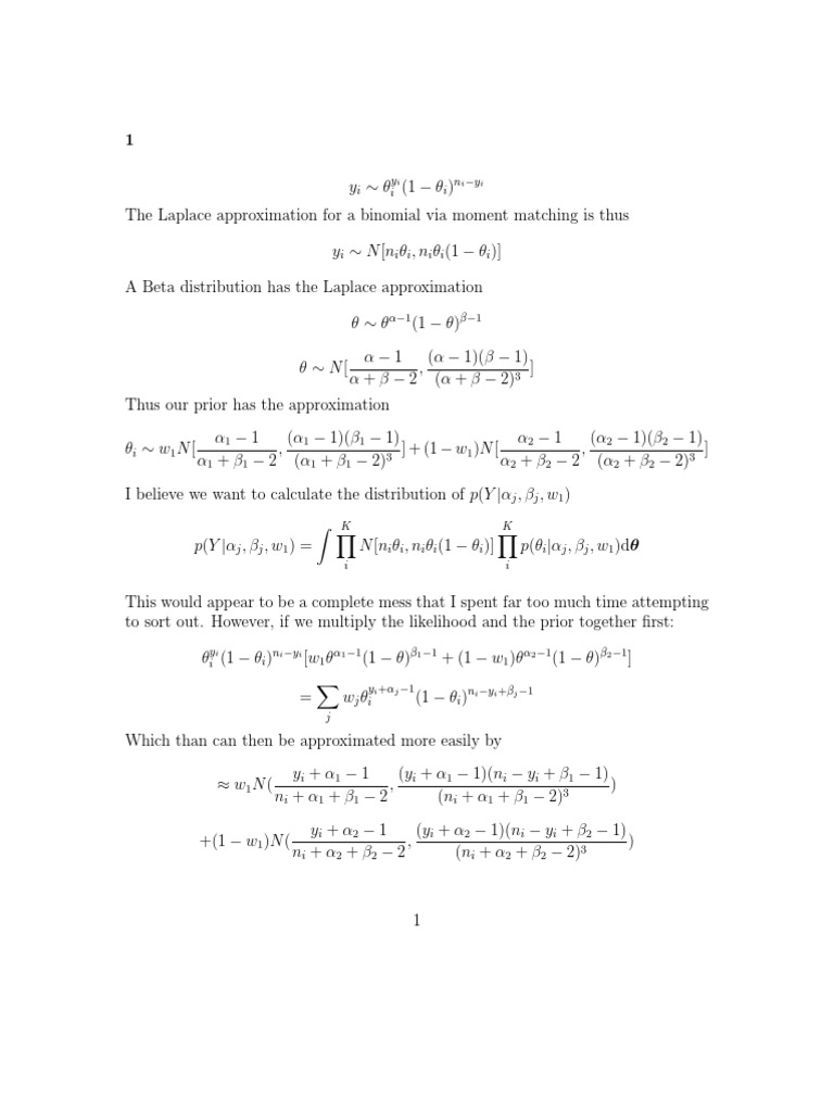 The Laplace approximation for a binomial via moment matching is thus yi N [ni i , ni i (1 i )] A Beta distribution has the Laplace approximation 1 (1 )1 N[ 1 ( 1)( 1) , ] + 2 ( + 2)3