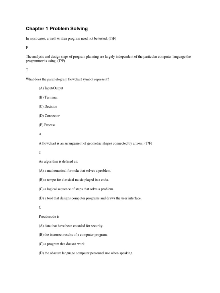 In most cases, a well-written program need not be tested. (T/F) F The analysis and design steps of program planning are largely independent of the particular computer language the programmer is using. (T/F) T What does the parallelogram flowchart symbol represent? (A) Input/Output (B) Terminal (C) Decision (D) Connector (E) Process A A flowchart is an arrangement of geometric shapes connected by arrows. (T/F) T An algorithm is defined as: (A) a mathematical formula that solves a problem. (B) a tempo for classical music played in a coda. (C) a logical sequence of steps that solve a problem. (D) a tool that designs computer programs and draws the user interface. C Pseudocode is (A) data that have been encoded for security. (B) the incorrect results of a computer program. (C) a program that doesn't work. (D) the obscure language computer personnel use when speaking.