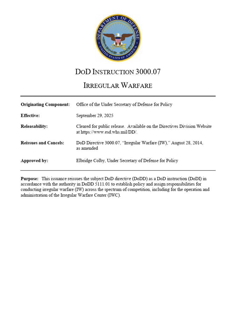 Reissues and Cancels: DoD Directive 3000.07, “Irregular Warfare (IW),” August 28, 2014,