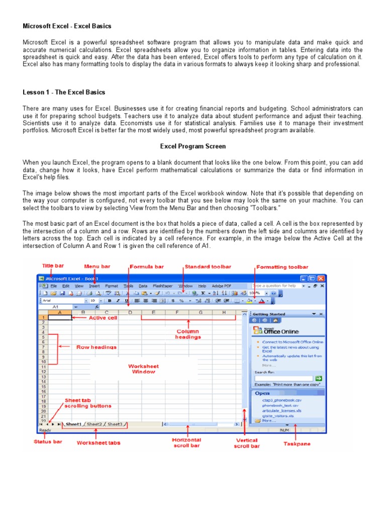 Lesson 1 - The Excel Basics There are many uses for Excel. Businesses use it for creating financial reports and budgeting. School administrators can use it for preparing school budgets. Teachers use it to analyze data about student performance and adjust their teaching. Scientists use it to analyze data. Economists use it for statistical analysis. Families use it to manage their investment portfolios. Microsoft Excel is better far the most widely used, most powerful spreadsheet program available. Excel Program Screen When you launch Excel, the program opens to a blank document that looks like the one below. From this point, you can add data, change how it looks, have Excel perform mathematical calculations or summarize the data or find information in Excel's help files. The image below shows the most important parts of the Excel workbook window. Note that it's possible that depending on the way your computer is configured, not every toolbar that you see below may look the same on your machine. You can select the toolbars to view by selecting View from the Menu Bar and then choosing "Toolbars." The most basic part of an Excel document is the box that holds a piece of data, called a cell. A cell is the box represented by the intersection of a column and a row. Rows are identified by the numbers down the left side and columns are identified by letters across the top. Each cell is indicated by a cell reference. For example, in the image below the Active Cell at the intersection of Column A and Row 1 is given the cell reference of A1.