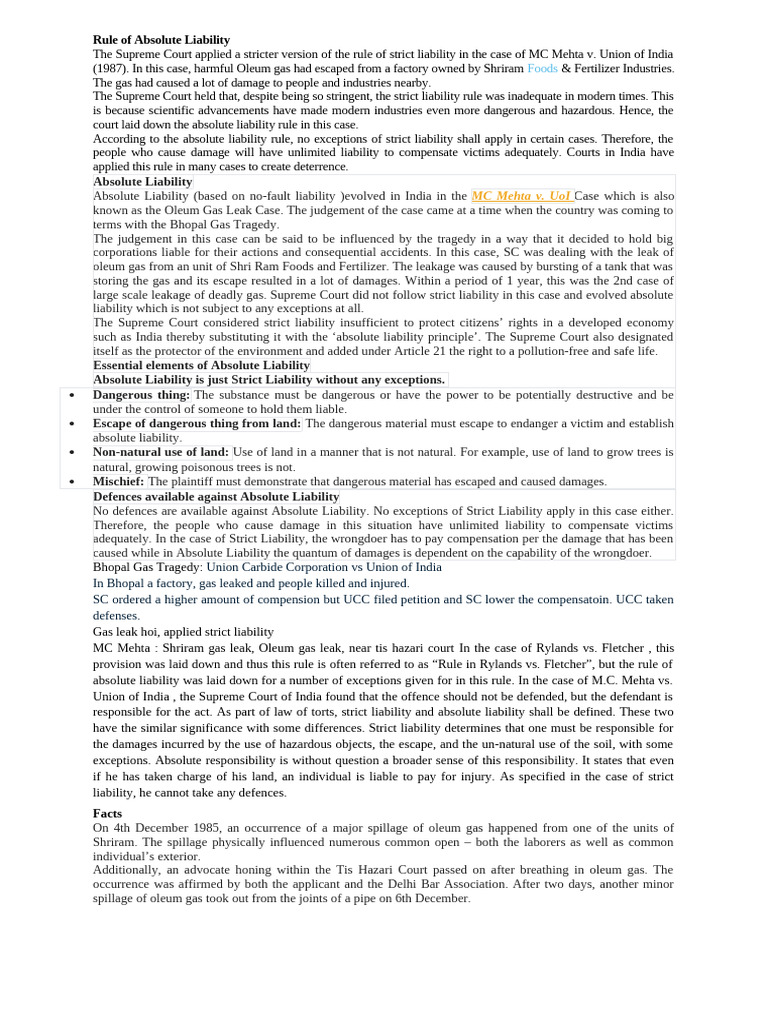 responsible for the act. As part of law of torts, strict liability and absolute liability shall be defined. These two