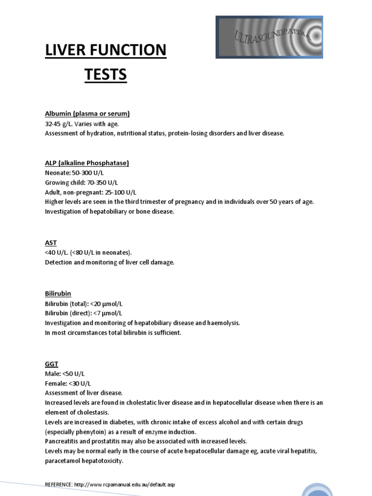 Male: <50 U/L Female: <30 U/L Assessment of liver disease. Increased levels are found in cholestatic liver disease and in hepatocellular disease when there is an element of cholestasis. Levels are increased in diabetes, with chronic intake of excess alcohol and with certain drugs (especially phenytoin) as a result of enzyme induction. Pancreatitis and prostatitis may also be associated with increased levels. Levels may be normal early in the course of acute hepatocellular damage eg, acute viral hepatitis, paracetamol hepatotoxicity.