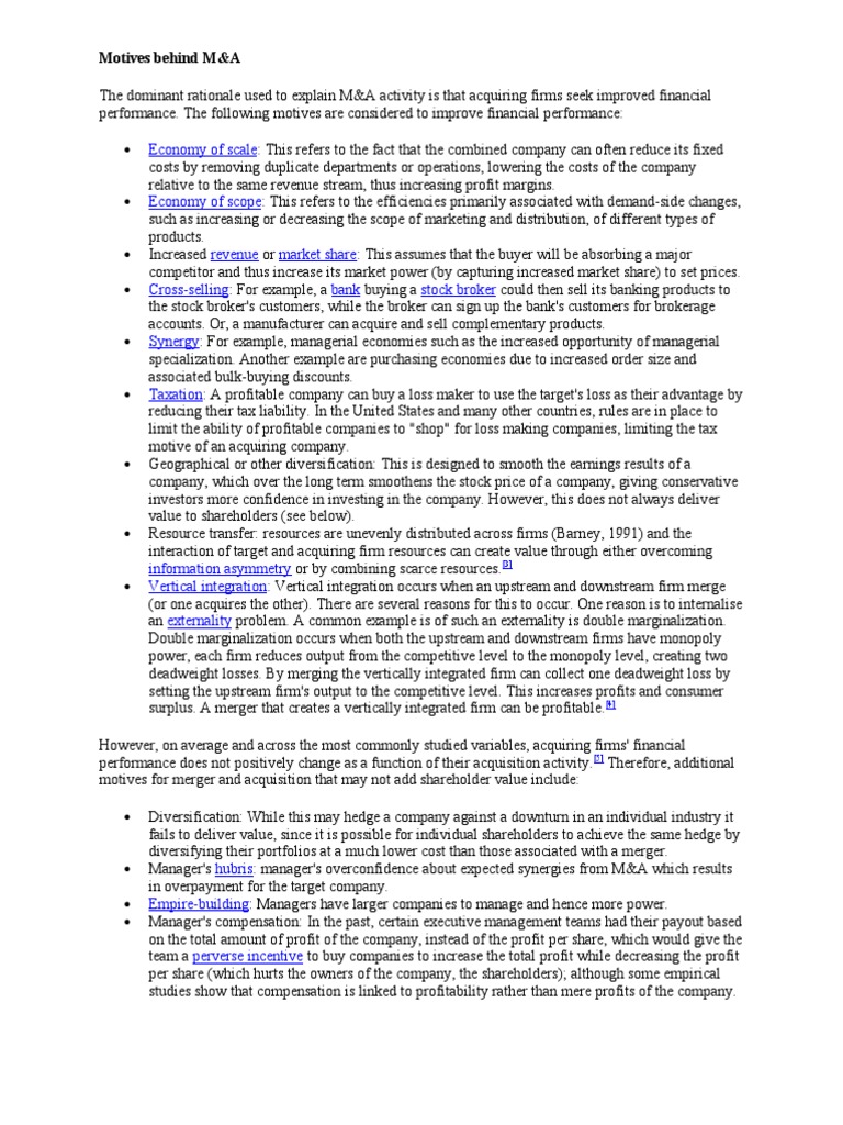 Motives behind M&A The dominant rationale used to explain M&A activity is that acquiring firms seek improved