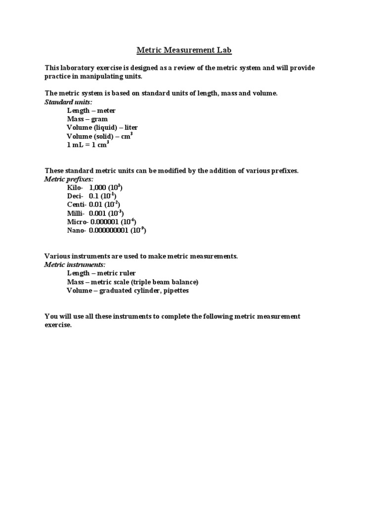 This laboratory exercise is designed as a review of the metric system and will provide practice in manipulating units. The metric system is based on standard units of length, mass and volume. Standard units: Length meter Mass gram Volume (liquid) liter Volume (solid) cm3 1 mL = 1 cm3 These standard metric units can be modified by the addition of various prefixes. Metric prefixes: Kilo- 1,000 (103) Deci- 0.1 (10-1) Centi- 0.01 (10-2) Milli- 0.001 (10-3) Micro- 0.000001 (10-6) Nano- 0.000000001 (10-9) Various instruments are used to make metric measurements. Metric instruments: Length metric ruler Mass metric scale (triple beam balance) Volume graduated cylinder, pipettes You will use all these instruments to complete the following metric measurement exercise.