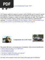 EXAMINATION OF FORK LIFT TRUCKS FORK LIFT TRUCKS SHOULD BE INSPECTED: o Before its first use o Daily by the driver o 12 monthly intervals (6 months if carrying persons) by a competent person o Complying with schedule o Circumstances that may compromise safety of the truck FORK LIFT TRUCKS Summary of Hazards o Overturning o Overloading o Loss of load o Collisions o Machine failure o Falling from loading bays o Explosions and fire o Exhaust fume emission o Passengers o Inappropriate parking o Manual handling o Vibration/noise o Silent running