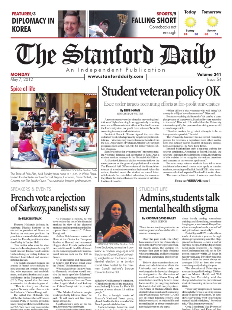 begin the threat, and a perfectly placed infield single down the third-base line by freshman rightfielder Dylan Davis moved him into scoring position. Piscotty got a second out but walked the next batter to load the bases for Dunn, whose ensuing single won the series for Oregon State. Stanford will not play a midweek game this week, getting a chance to recuperate before hosting Washington State (23-20, 9-11 Pac-12) this coming weekend. The series opener at Sunken Diamond will start at 6 p.m on Friday. Contact Joseph Beyda at jbeyda @stanford.edu. ers slamming into each other on every play is one thing, but players doing their best to injure an opponent is even more troubling. Combine this with stories of former players like Seau who, for whatever reason, cannot live normal lives after playing football, and the long-term viability of football really becomes questionable. Because lets be honest: non-contact football is not a reasonable option. Theres no easy answer to solve the issues with football and player safety, but acknowledging that there is a real problem is the first step toward saving and improving the game. And when days like Wednesday come around, its impossible to ignore that there is a real problem with football. Jacob Jaffe is still upset about the career-ending concussion he sustained at last years Ink Bowl. Help him get back to living his normal life at jwjaffe@stanford.edu and follow him on Twitter @Jacob_ Jaffe. ans admission website. Given the recent conflicts, many of these students have had multiple tours. The website continued to say the life experience that students bring from previous career paths or military service provides a unique perspective in discussion seminars, student groups and campus activities. At Stanford, were used to hearing the top-down view of the military or organizations as a whole, Clark said, citing events featuring CEOs of corporations and military colonels. When you get veterans from enlisted ranks, you get a very bottom-up level of military perspective. Contact Erin Inman at einman@stanford.edu.