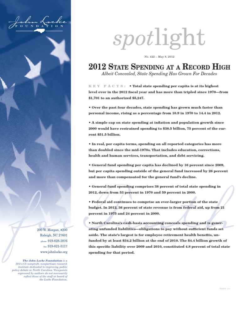 Concluding Remarks Along with a correction to confused discourse on the matter, the finding that state spending has grown so markedly, and in a concealed manner, carries clear implications. First, since the growth has been so consistent in one direction, against the wishes of constituents, a constitutional protection appears necessary. That could come in the form of a simple cap on spending at inflation and population growth or a super-majority requirement for any such spending or tax increases. Second, those who study and report on the states spending would do well to bear in mind that the general fund represents only approximately one third of the total and is not an accurate gauge of overall spending. Further, the official budget does not account for deferred compensation that generates unfunded liabilities. Third, debt-financed federal aid comprises a growing portion of state spending, which enables the state to bypass its balanced budget amendment and increase spending beyond tax revenues. Given the precarious and severe indebtedness of the federal government, such transfers merit opposition from North Carolinas federal representatives, along with calls for a federal balanced budget amendment similar to what 49 of the 50 states have. Fergus Hodgson is Director of Fiscal Studies for the John Locke Foundation.
