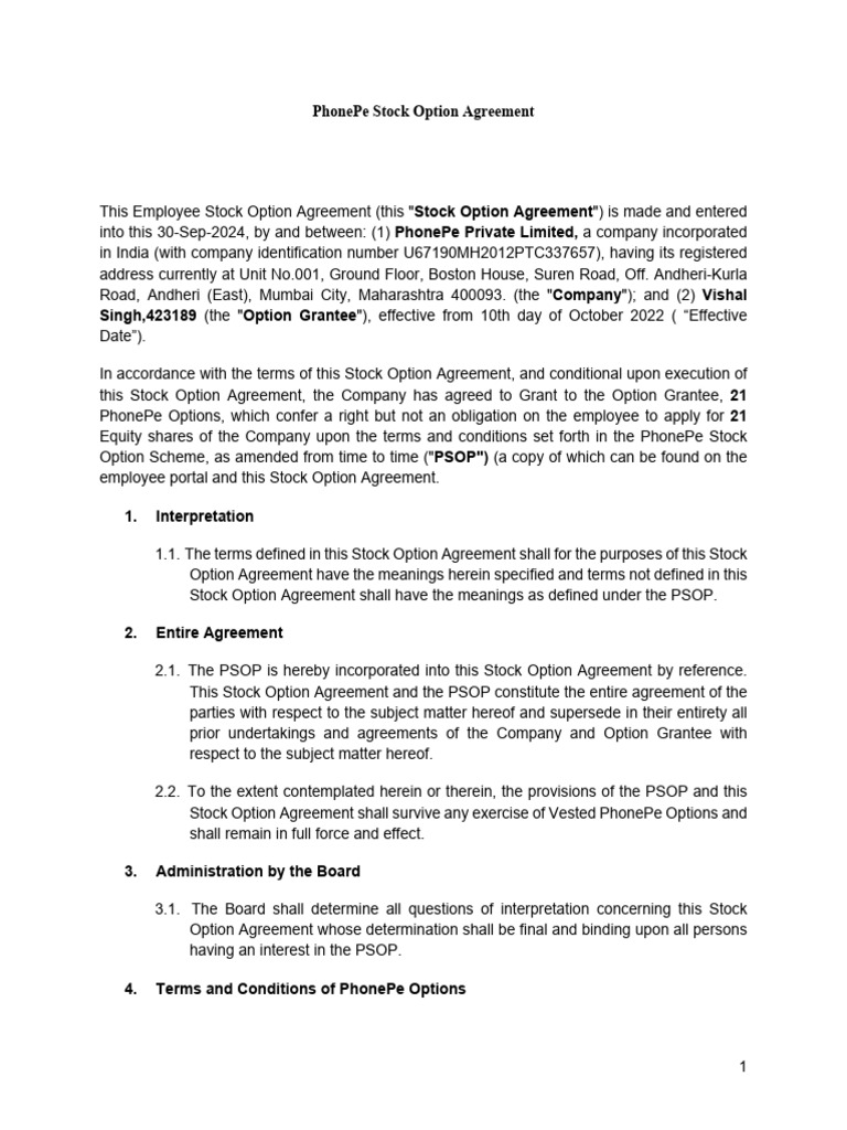 PhonePe Stock Option Agreement