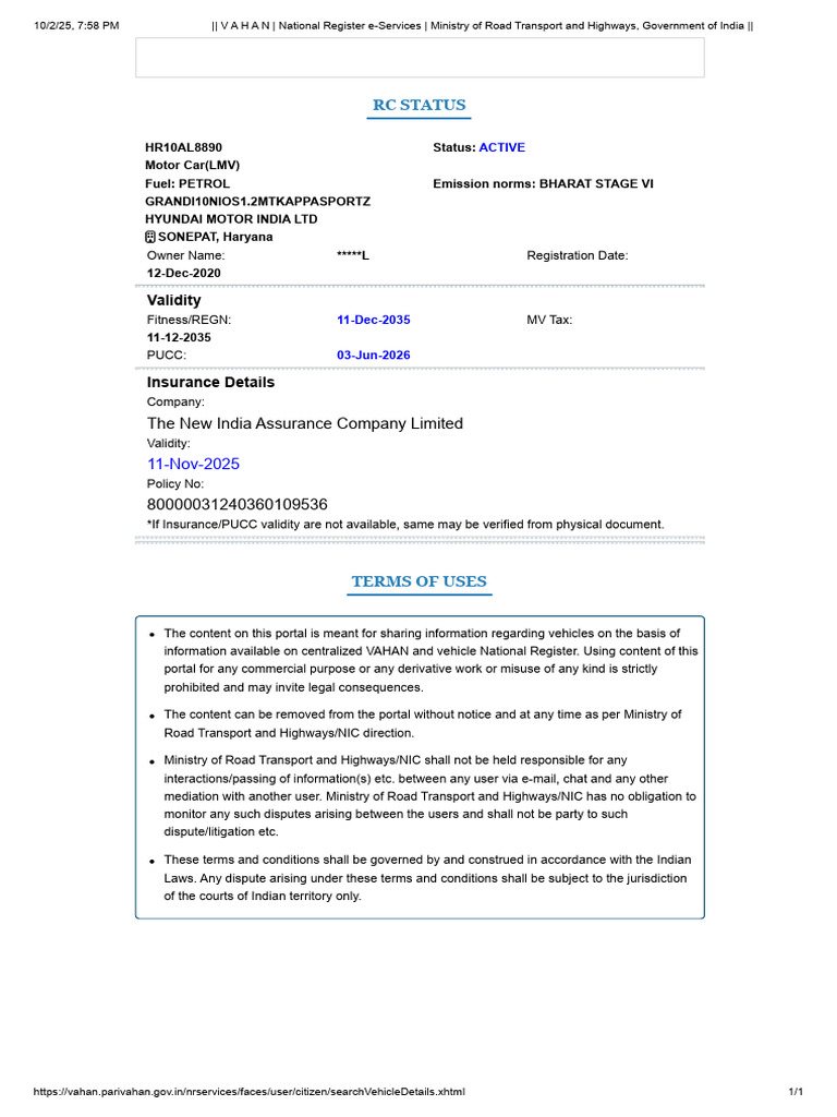 10/2/25, 7:58 PM || V A H A N | National Register e-Services | Ministry of Road Transport and Highways, Government of India ||