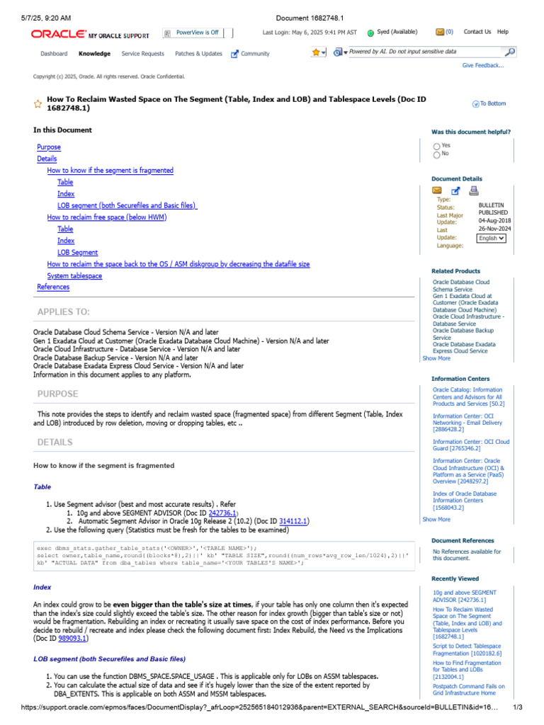 This note provides the steps to identify and reclaim wasted space (fragmented space) from different Segment (Table, Index Information Center: OCI