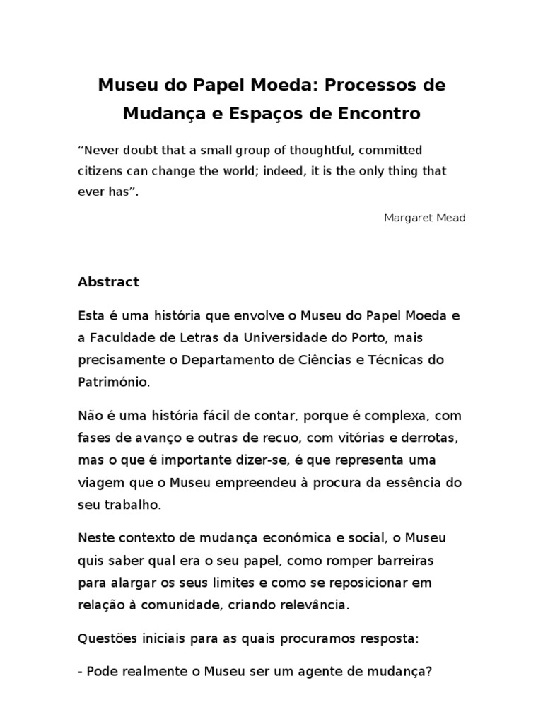 Abstract Esta uma histria que envolve o Museu do Papel Moeda e a Faculdade de Letras da Universidade do Porto, mais precisamente o Departamento de Cincias e Tcnicas do Patrimnio. No uma histria fcil de contar, porque complexa, com fases de avano e outras de recuo, com vitrias e derrotas, mas o que importante dizer-se, que representa uma viagem que o Museu empreendeu procura da essncia do seu trabalho. Neste contexto de mudana econmica e social, o Museu quis saber qual era o seu papel, como romper barreiras para alargar os seus limites e como se reposicionar em relao comunidade, criando relevncia. Questes iniciais para as quais procuramos resposta: - Pode realmente o Museu ser um agente de mudana?
