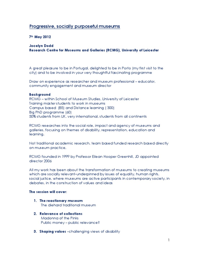 On the one hand Glasgow has a radical left wing politics, on the other hand the influence of Catholicism can lead to social conservatism Yet progressive museums have been through an active process of transformation, rethinking the very essence of their role and work, revisiting their mission, their working practices to enable them to be active, vital, engaging, socially purposeful public spaces which use collections to enable visitors to 10