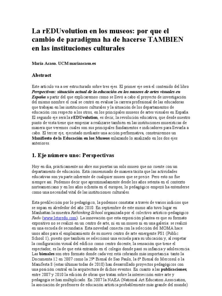 Este artculo va a ser estructurado sobre tres ejes. El primer eje ser el contenido del libro Perspectivas: situacin actual de la educacin en los museos de artes visuales en Espaa a partir del que explicaremos como se llev a cabo el proyecto de investigacin del mismo nombre el cual se centr en evaluar la carrera profesional de las educadoras que trabajan en las instituciones culturales y la situacin de los departamentos de educacin con respecto a los otros, en los principales museos de artes visuales en Espaa. El segundo eje ser la rEDUvolution, es decir, la revolucin educativa, que desde nuestro punto de vista tiene que empezar a realizarse tambin en las instituciones musesticas de manera que veremos cuales son sus principales fundamentos e indicadores para llevarla a cabo. El tercer eje, ejecutado mediante una accin performativa, construiremos un Manifiesto de la Educacin en los Museos enlazando lo analizado en los dos ejes anteriores.
