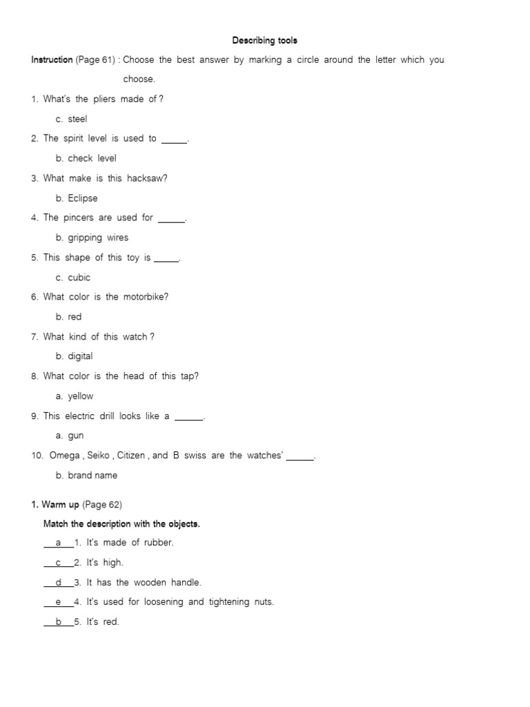 Exercise 4 (Page 68) : Match the name of the tools with their uses.