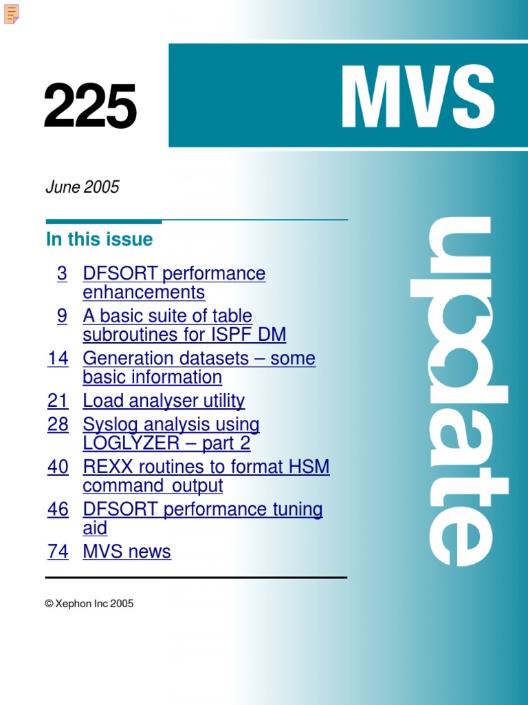 In this issue 3 DFSORT performance enhancements 9 A basic suite of table subroutines for ISPF DM 14 Generation datasets some basic information 21 Load analyser utility 28 Syslog analysis using LOGLYZER part 2 40 REXX routines to format HSM command output 46 DFSORT performance tuning aid 74 MVS news