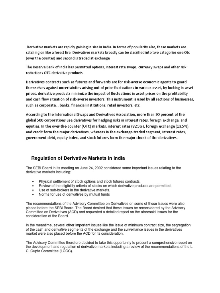Four years have elapsed since the LCGC Report of March 1998. During this period therehave been several significant changes in the structure of the Indian Capital Markets which include, dematerialisation of shares, rolling settlement on a T+3 basis, client level and Value at Risk (VaR) based margining in both the derivative and cash markets and proposed demutualization of Exchanges. Equity derivative markets have now been in existence for two years and the markets have grown in size and diversity of products.This therefore appears to be an appropriate time for a comprehensive review of the development and regulation of derivative markets.