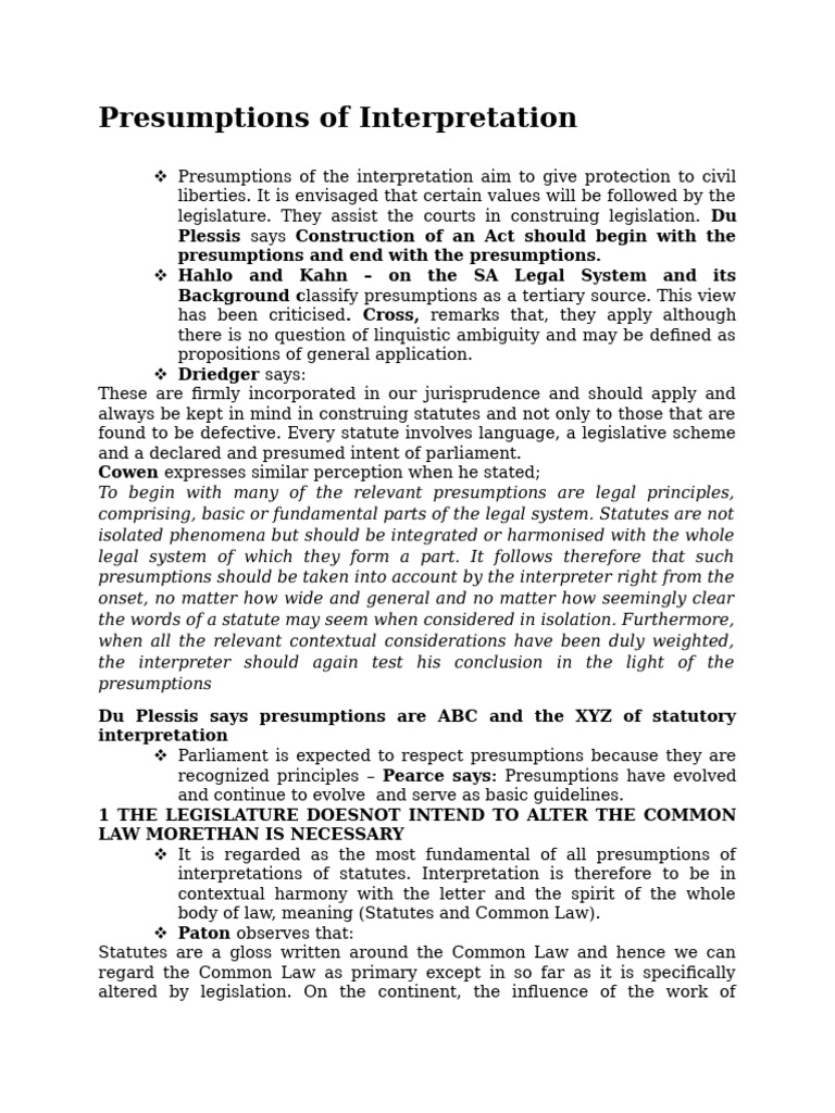 Du Plessis says presumptions are ABC and the XYZ of statutory