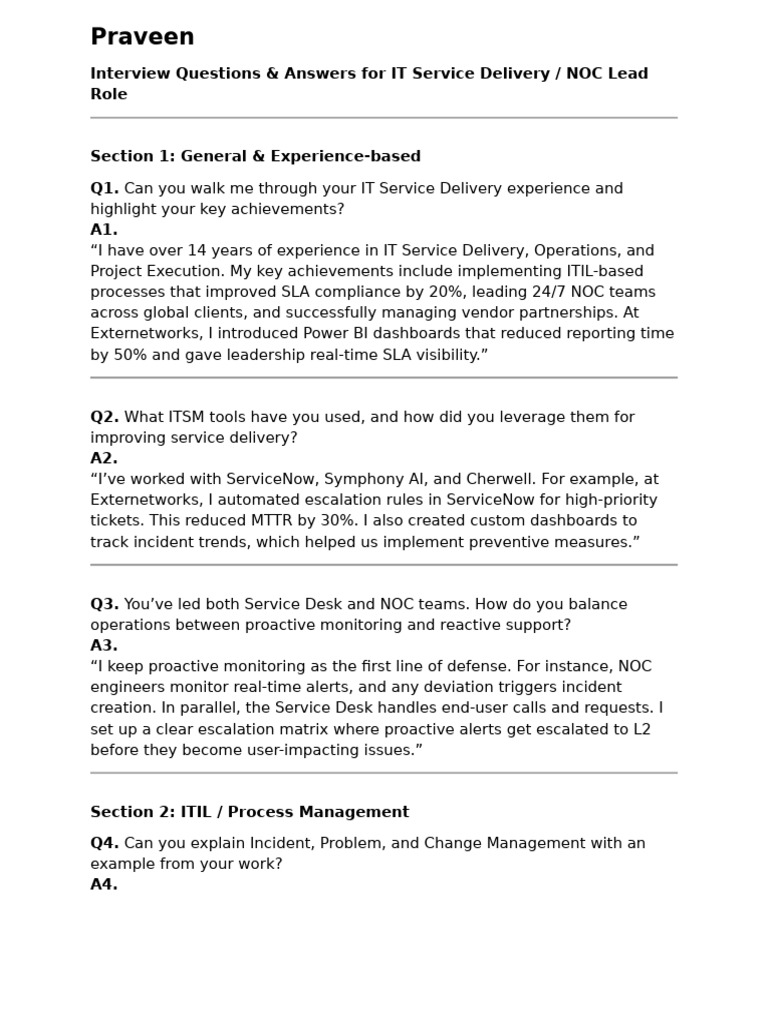 Interview Questions & Answers for IT Service Delivery / NOC Lead