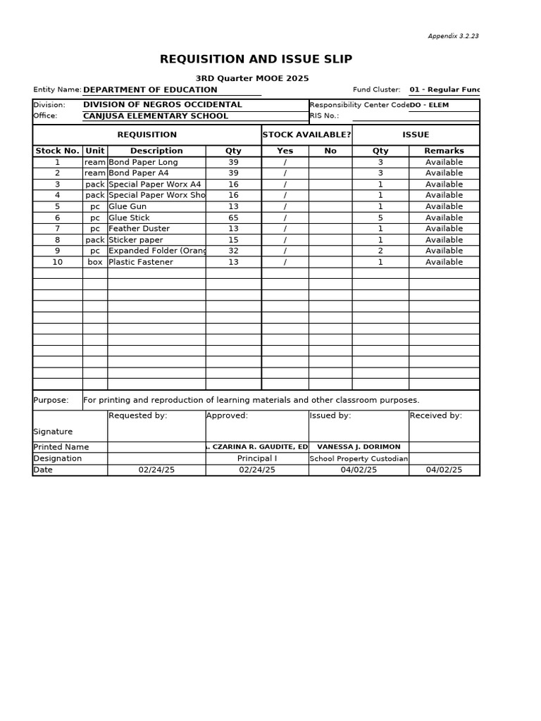 Printed Name MA. CZARINA R. GAUDITE, ED.D.VANESSA J. DORIMON