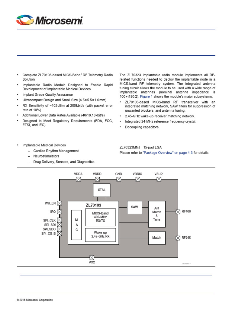 • Complete ZL70103-based MICS-Band1 RF Telemetry Radio The ZL70323 implantable radio module implements all RF-