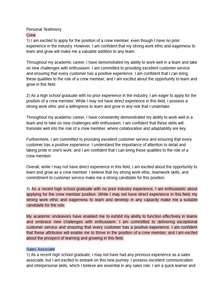 applying for the crew member position. While I may not have direct experience in this field, my