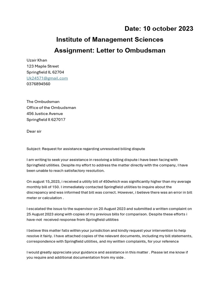 Assignment: Letter to Ombudsman