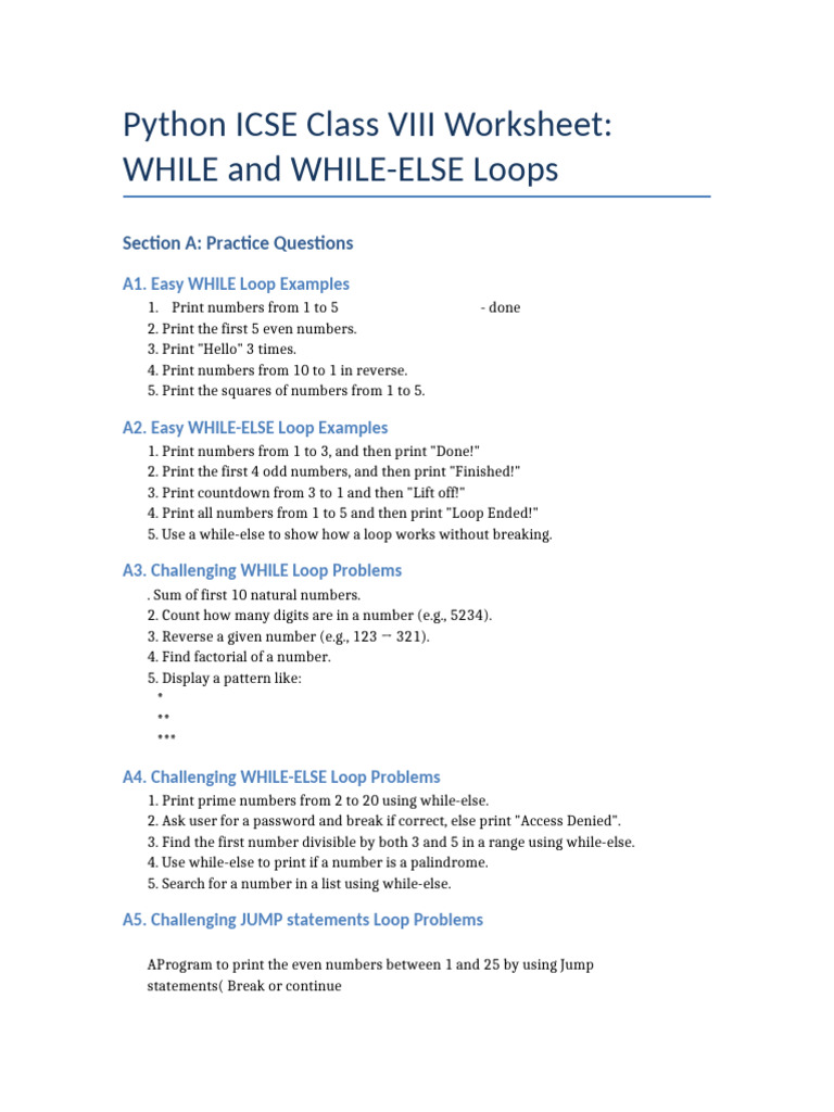 Python ICSE Class VIII Worksheet: