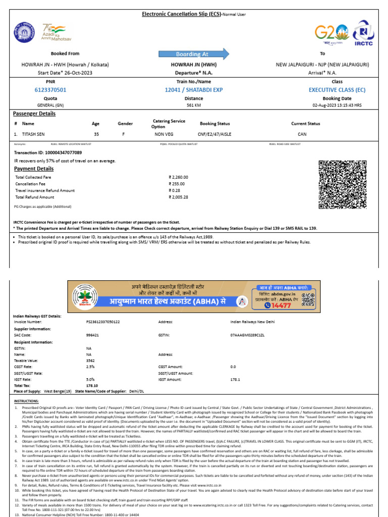 Invoice Number: PS23612337050122 Address: Indian Railways New Delhi