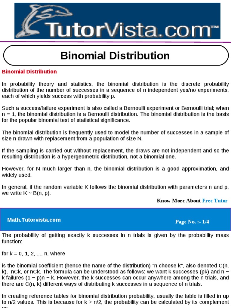 Binomial Distribution In probability theory and statistics, the binomial distribution is the discrete probability distribution of the number of successes in a sequence of n independent yes/no experiments, each of which yields success with probability p. Such a success/failure experiment is also called a Bernoulli experiment or Bernoulli trial; when n = 1, the binomial distribution is a Bernoulli distribution. The binomial distribution is the basis for the popular binomial test of statistical significance. The binomial distribution is frequently used to model the number of successes in a sample of size n drawn with replacement from a population of size N. If the sampling is carried out without replacement, the draws are not independent and so the resulting distribution is a hypergeometric distribution, not a binomial one. However, for N much larger than n, the binomial distribution is a good approximation, and widely used. In general, if the random variable K follows the binomial distribution with parameters n and p, we write K ~ B(n, p). Know More About Free Tutor Math.Tutorvista.com