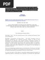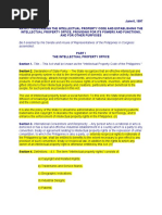 AN ACT PRESCRIBING THE INTELLECTUAL PROPERTY CODE AND ESTABLISHING THE INTELLECTUAL PROPERTY OFFICE, PROVIDING FOR ITS POWERS AND FUNCTIONS, AND FOR OTHER PURPOSES Be it enacted by the Senate and House of Representatives of the Philippines in Congress assembled:: PART I THE INTELLECTUAL PROPERTY OFFICE Section 1. Title. - This Act shall be known as the "Intellectual Property Code of the Philippines." Section 2. Declaration of State Policy. - The State recognizes that an effective intellectual and industrial property system is vital to the development of domestic and creative activity, facilitates transfer of technology, attracts foreign investments, and ensures market access for our products. It shall protect and secure the exclusive rights of scientists, inventors, artists and other gifted citizens to their intellectual property and creations, particularly when beneficial to the people, for such periods as provided in this Act. The use of intellectual property bears a social function. To this end, the State shall promote the diffusion of knowledge and information for the promotion of national development and progress and the common good. It is also the policy of the State to streamline administrative procedures of registering patents, trademarks and copyright, to liberalize the registration on the transfer of technology, and to enhance the enforcement of intellectual property rights in the Philippines. (n) Section 3. International Conventions and Reciprocity. - Any person who is a national or who is domiciled or has a real and effective industrial establishment in a country which is a party to any convention, treaty or agreement relating to intellectual property rights or the repression of unfair competition, to which the Philippines is also a party, or extends reciprocal rights to nationals of the Philippines by law, shall be entitled to benefits to the extent necessary to give effect to any provision of such convention, treaty or reciprocal law, in addition to the rights to which any owner of an intellectual property right is otherwise entitled by this Act. (n) Section 4. Definitions. - 4.1. The term "intellectual property rights" consists of: a) Copyright and Related Rights; b) Trademarks and Service Marks; c) Geographic Indications; d) Industrial Designs; e) Patents; f) Layout-Designs (Topographies) of Integrated Circuits; and g) Protection of Undisclosed Information (n, TRIPS). 4.2. The term "technology transfer arrangements" refers to contracts or agreements involving the transfer of systematic knowledge for the manufacture of a product, the application of a process, or rendering of a service including management contracts; and the transfer, assignment or licensing of all forms of intellectual property rights, including licensing of computer software except computer software developed for mass market. 4.3. The term "Office" refers to the Intellectual Property Office created by this Act.
