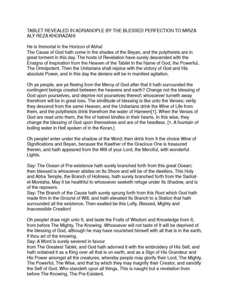 TABLET REVEALED IN ADRIANOPLE BY THE BLESSED PERFECTION TO MIRZA